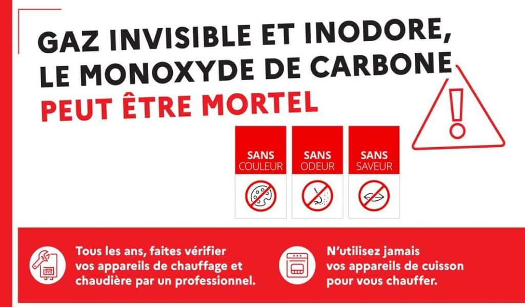 Le monoxyde de carbone est un gaz invisible, inodore, non irritant mais très toxique. Sa présence résulte d’une mauvaise combustion au sein d’un appareil fonctionnant au gaz, au bois, au charbon, à l’essence, au fioul ou encore à l’éthanol. Il prend la place de l’oxygène dans le sang et peut être mortel en moins d’une heure. Les maux de tête, nausées, vertiges et troubles visuels sont les premiers symptômes d’une intoxication.