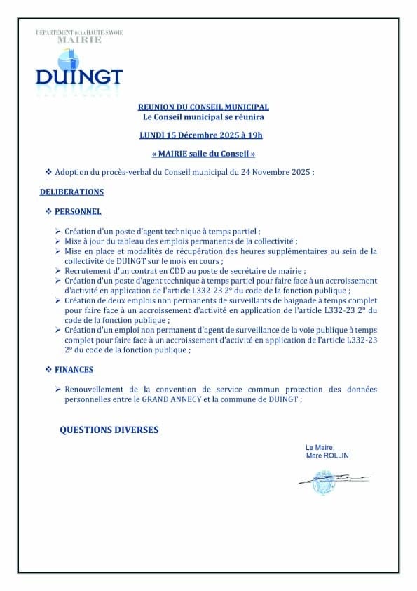 Le prochain conseil municipal se tiendra le lundi 15 décembre 2025 à 19h00 dans la salle du conseil à la mairie de Duingt. Cela sera le dernier de l'année 2025.
