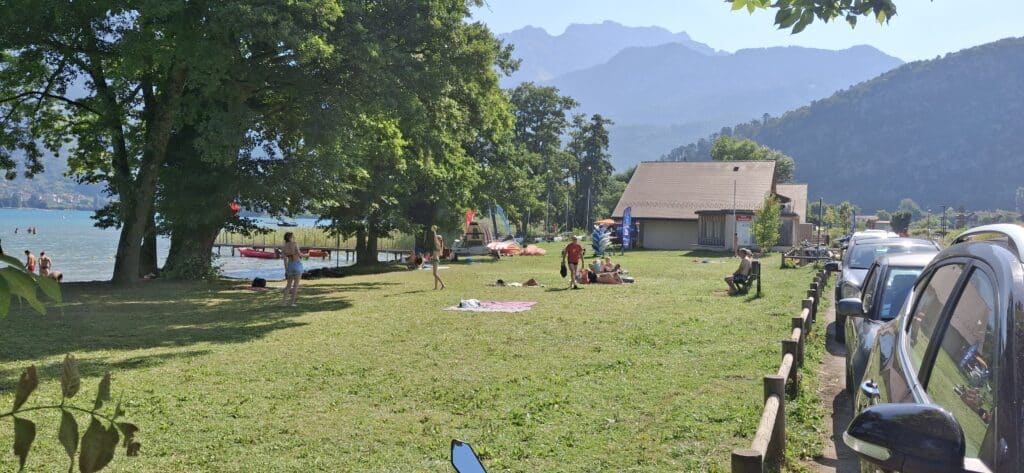Duingt possède une belle plage en herbe, gratuite, qui descend lentement dans le lac, elle est ombragée par de grands arbres.